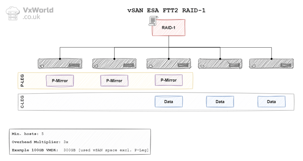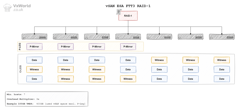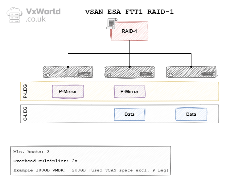 In the context of vSAN, the data is mirrored between hosts (fault domains). For a FTT of 1, the data will be mirrored across two hosts – requiring a minimum of three hosts. With a FTT of 2, the data will be mirrored across three hosts – requiring a minimum of five hosts. With a FTT of 3, data will be mirrored across fours hosts – requiring a minimum of seven hosts. The diagrams later in this post will depict the other components RAID 1 needs. It includes witness components in the case of OSA. In the case of ESA, it used the Performance leg in place of the witness components.