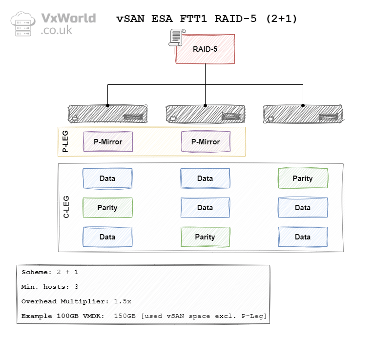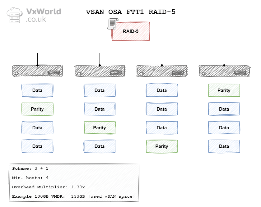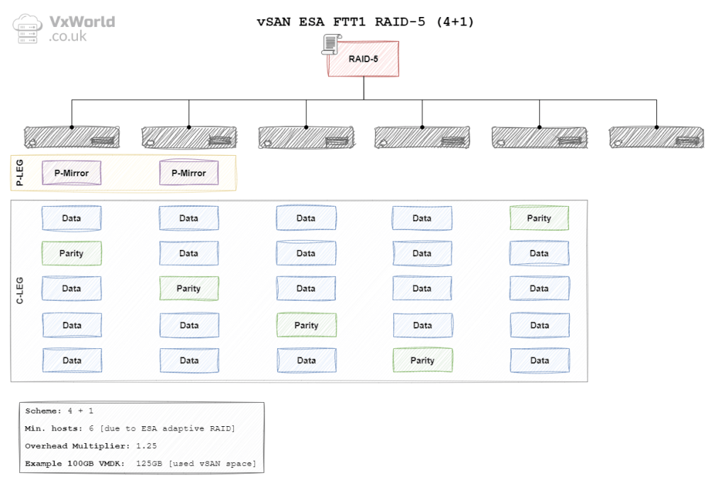 Unfortunately I have not found a calculation that works for RAID 5 and RAID 6. RAID 6 is easy to remember as it needs 6 hosts – this is true for both OSA and ESA. However, RAID 5 requires you to remember the number of required hosts. However, I found the diagrams below useful for that, as I can picture them in my head.