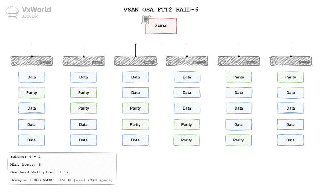 In the final part of this post, I have added all the diagrams for each Storage Policy. Each diagram shows how the data is distributed across the hosts. It also summarizes the key information, including Minimum Number of Hosts*, Overhead Multiplier, and 100GB VMDK example.