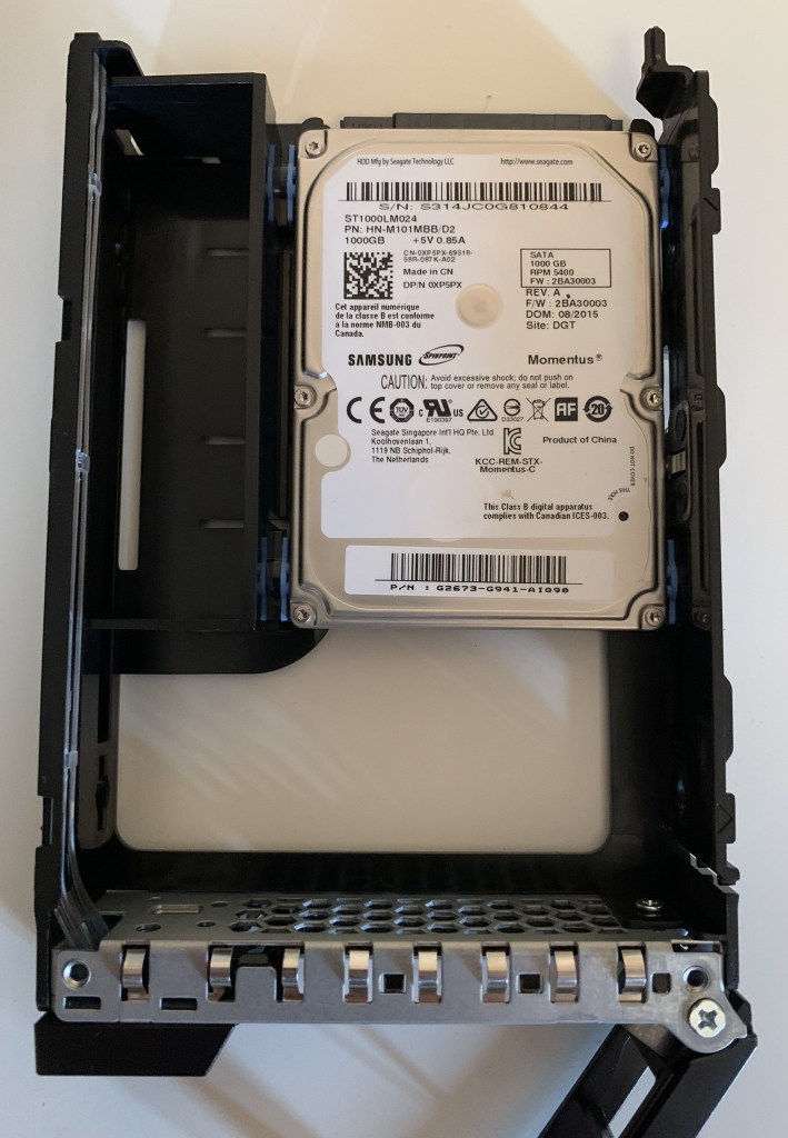 Below is one of the Flex Bay caddies removed. As you can see, they are designed to take both 3.5″ and 2.5″ disks. They are a screw less design and very easy to change the disks. For testing, I have installed a standard 2.5″ mechanical HDD. I will be swapping that out for a small SSD to install the ESXi OS onto. (Standard consumer HDDs and SSDs appear to work within these Flex Bays)