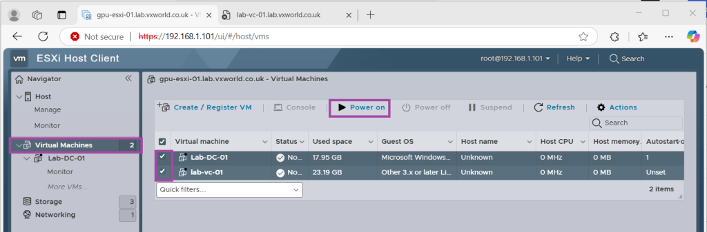 - Log onto the ESXi Host Client that contains the vCenter (i.e. not the vCenter IP/DNS)