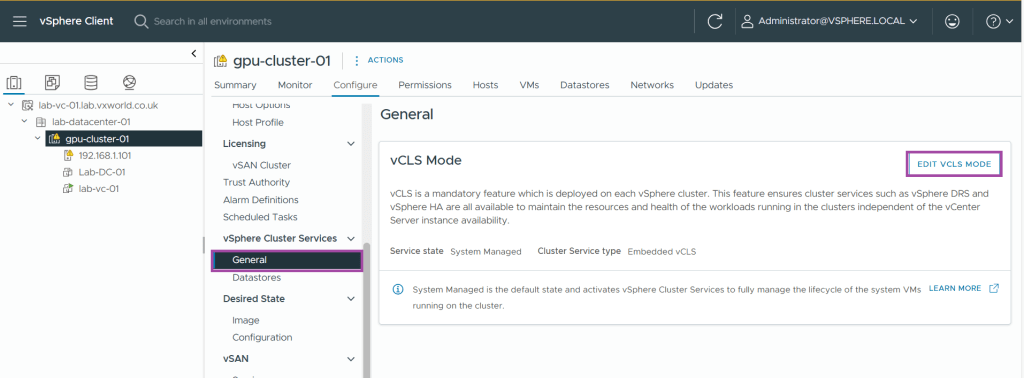- Configure (tab) -> vSphere Cluster Services -> General -> vCLS