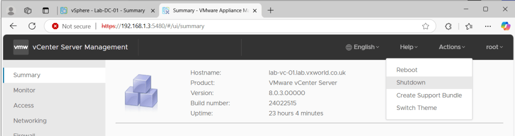 - Shutdown vCenter via the VAMI interface. In my example, that is https://192.168.1.3:5480 (I needed to use the IP address and the domain controller that is also my DNS server has been shutdown)