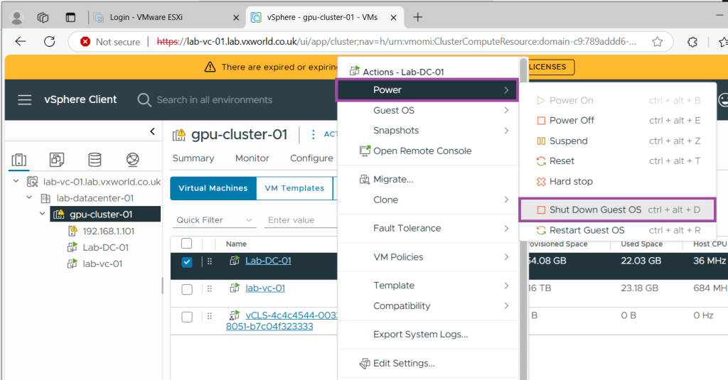 - Power on the vCenter server and other VMs you shutdown. In my example, that is vCenter server and the Domain Controller