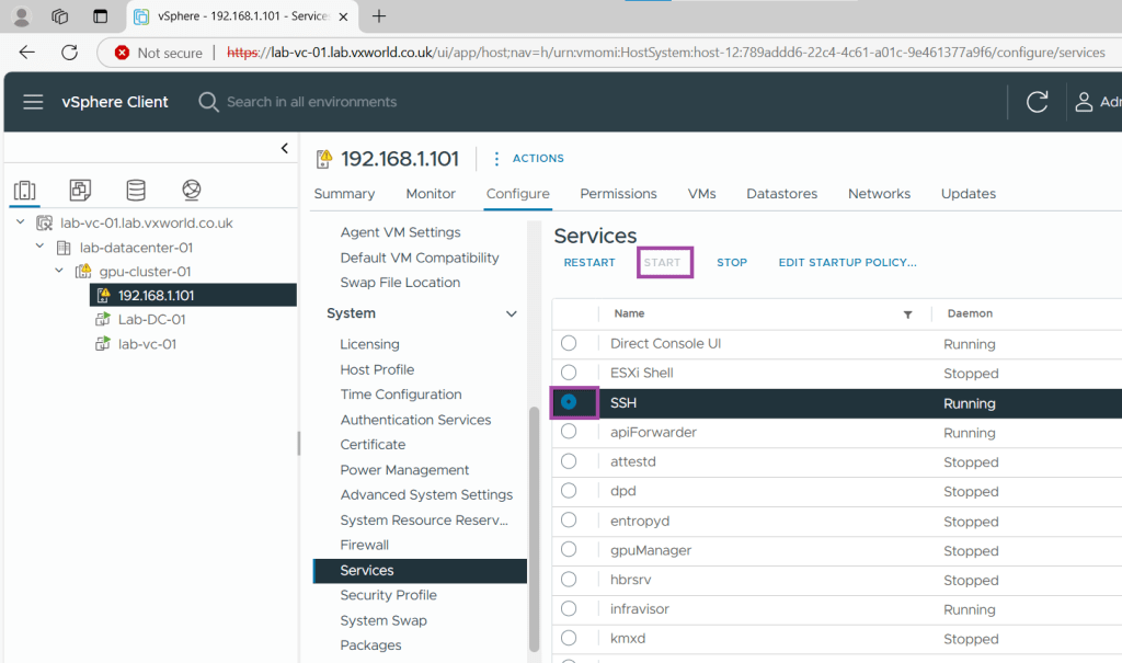 Now we have the file accessible on the ESXi host, we will SSH onto it and install it via the CLI. First we will need to enable SSH on the ESXi host, then we will be SSH onto it to install the VIBs.