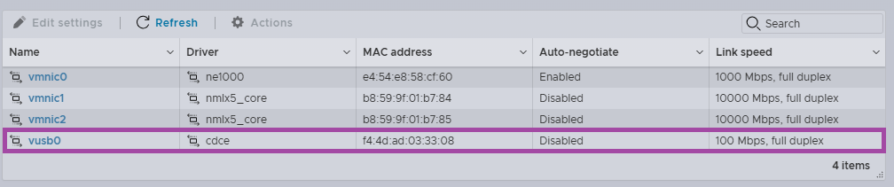 After connecting the USB NIC but prior to installing the drivers, vusb0 was listed but the link speed was displayed at 100 Mbps and it always showed as connected even when physically disconnected!