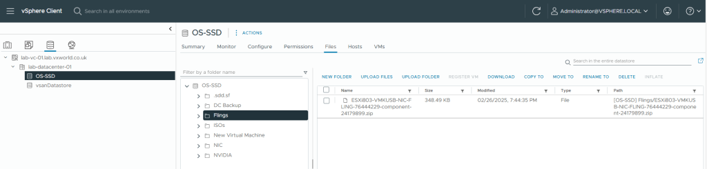- Select the ESXi803-VMKUSB-NIC-FLING-76444229-component-24179899.zip file (substitute the version numbers.)