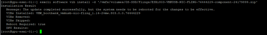 Command: esxcli software vib install -d /vmfs/volumes/OS-SSD/Flings/ESXi803-VMKUSB-NIC-FLING-76444229-component-24179899.zip
