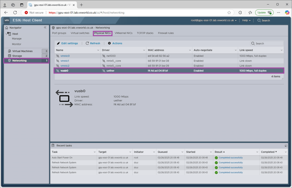 - After rebooting, we can validate the NIC is now showing in vSphere