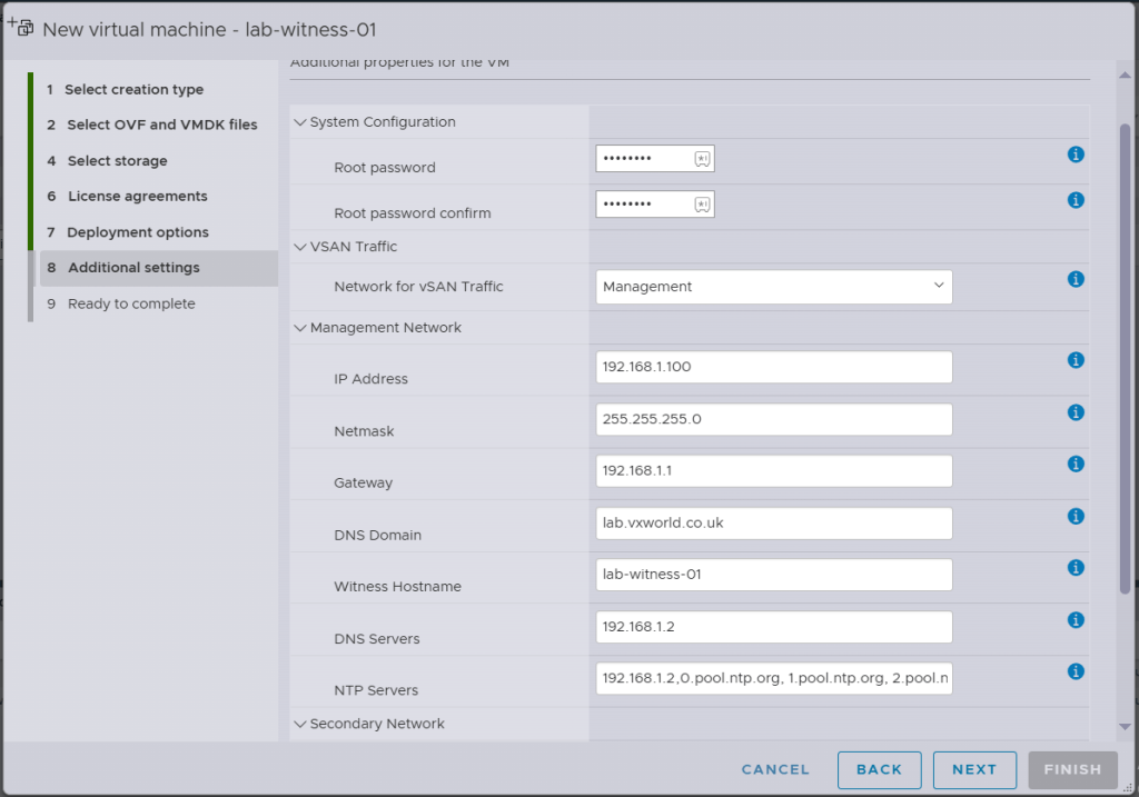 In my lab setup, I have two hosts directly connected for vSAN. These hosts will utilise their management interface (vmk0), which is connected to the VM Management Network to communicate with the witness. Given this configuration, the Secondary Network is not required in my lab environment. However, since there is no option to leave the Secondary Network disconnected, I will connect it to the same network as the Management Network.