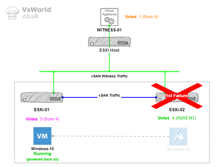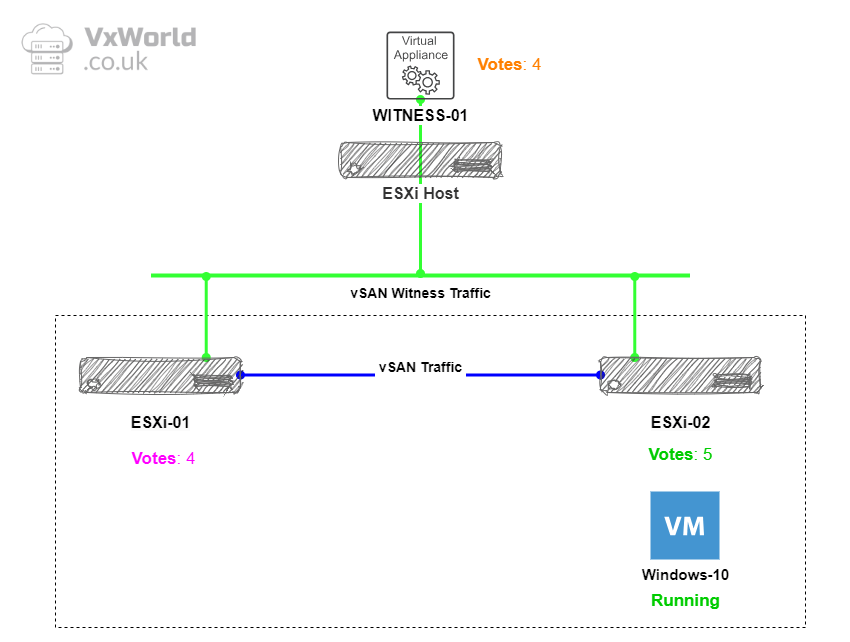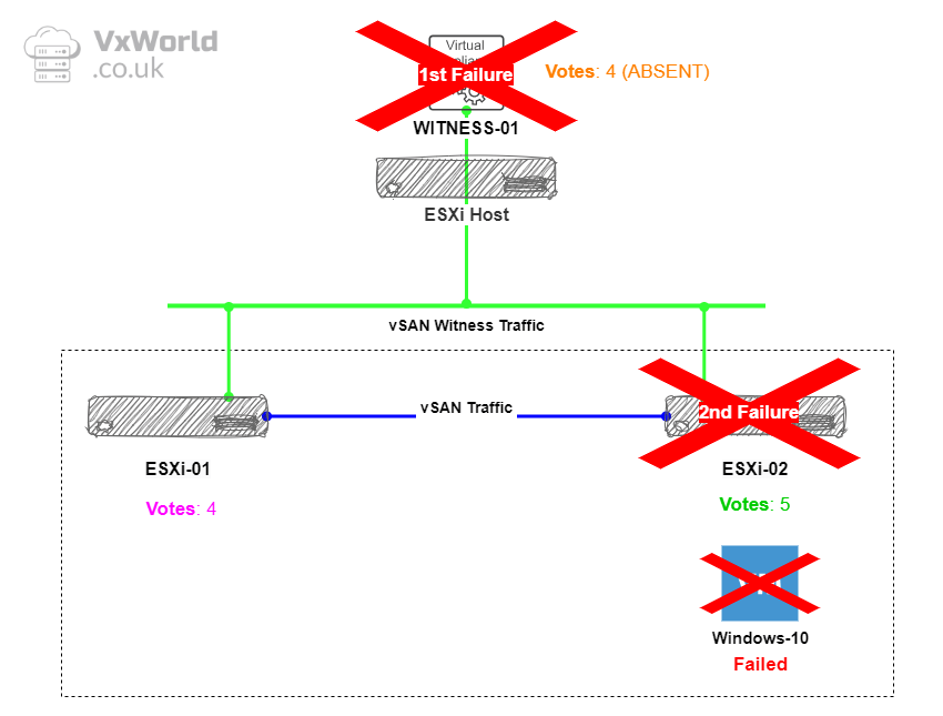 Based on the example above, if the witness fails, there are 9 votes out of 13 remaining, thus retaining quorum. If ESXi-01 fails, there are 9 votes out of 13 remaining, retaining quorum. If ESXi-02 fails, there are 8 votes out of 13 remaining, which still retains quorum.