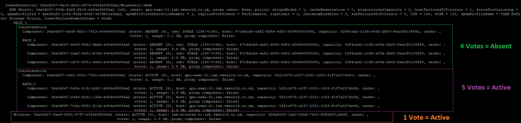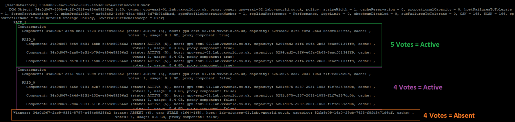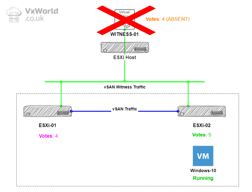 As you can see from the screenshot, ESXi-02 and the witness components as absent and the votes have remained the same