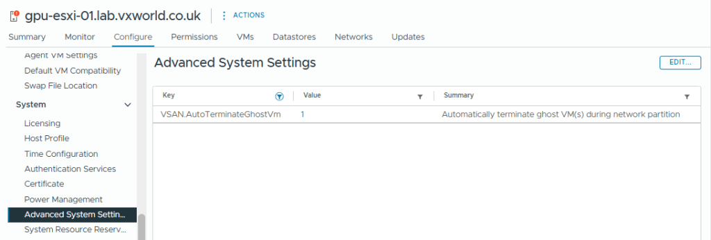 The vSAN setting that will terminate ‘ghosted’ VMs running on an partitioned vSAN node is VSAN.AutoTerminateGhostVm. This was enabled by default on my host but you can check it by selecting the Host -> Configure -> System -> Advanced System Settings and filtering for VSAN.AutoTerminateGhostVm and it should be set to 1. If you want to know more, check out How HA handles a VSAN Stretched Cluster Site Partition