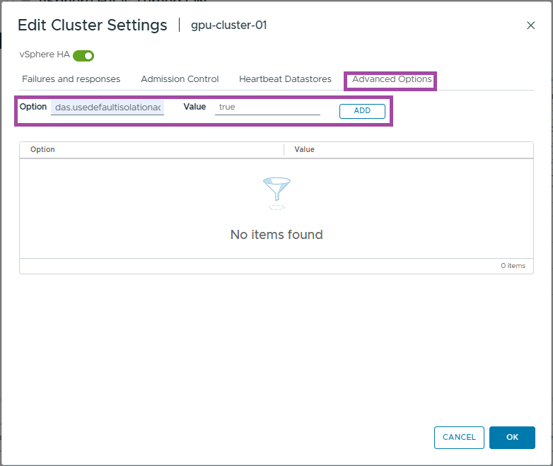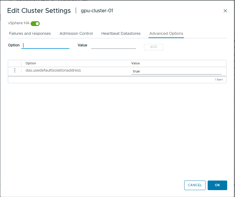 3. Have a gateway set on the management vmkernel. (Alternatively, you could set das.isolationaddress to 127.0.0.1 and set das.usedefaultisolationaddress to false, preventing ‘This host has no isolation addresses defined as required by vSphere HA’ the error from popping up)