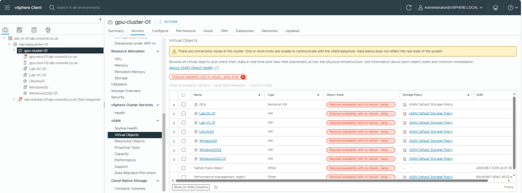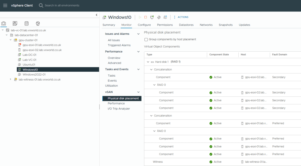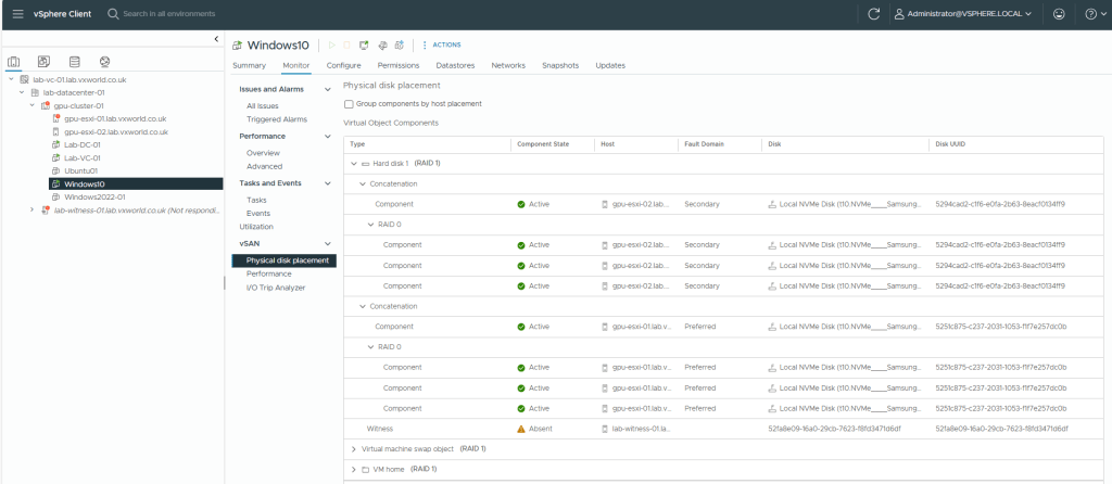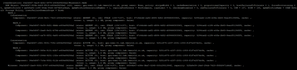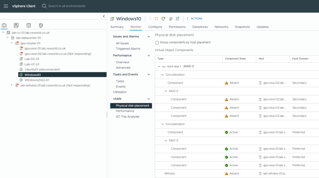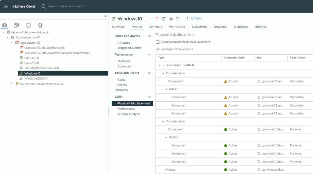 What about the vSAN side? We can see that the Windows-10 components on ESXi-02 are marked as Absent, but the witness and components on ESXi-01 are still Active.