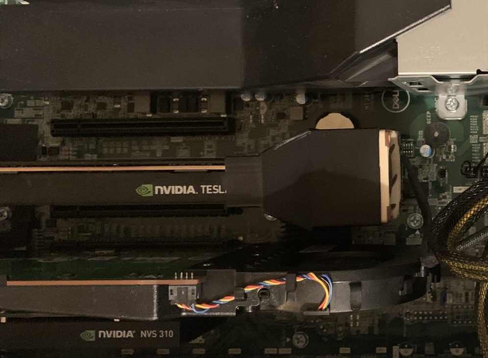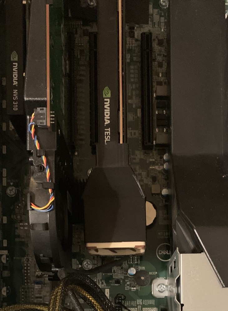 The Tesla P4 is passively cooled and designed for server chassis airflow. My Dell Precision 5820 workstations have a front chassis fan that blows air over the PCIe slots. However, to provide adequate cooling, I had to increase the fan speed—turning my workstation into something that sounded like a jet engine.