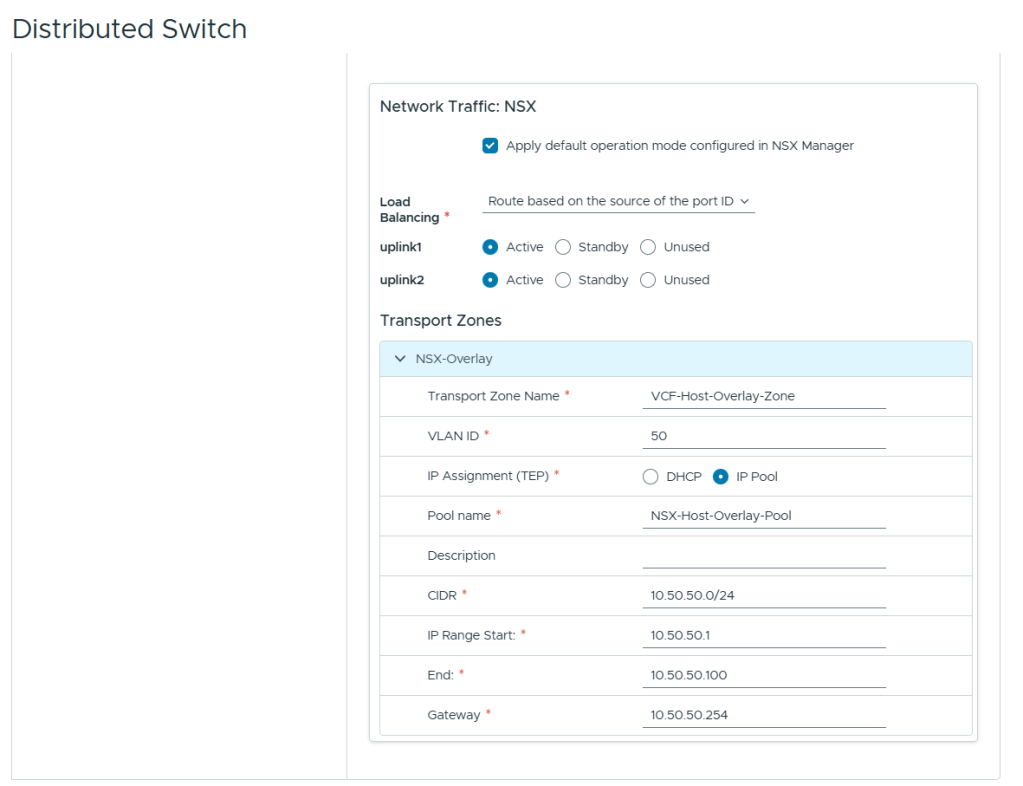 | vcf-m1-nsx01 | 10.50.10.31 | Mgmt. Domain NSX Node |