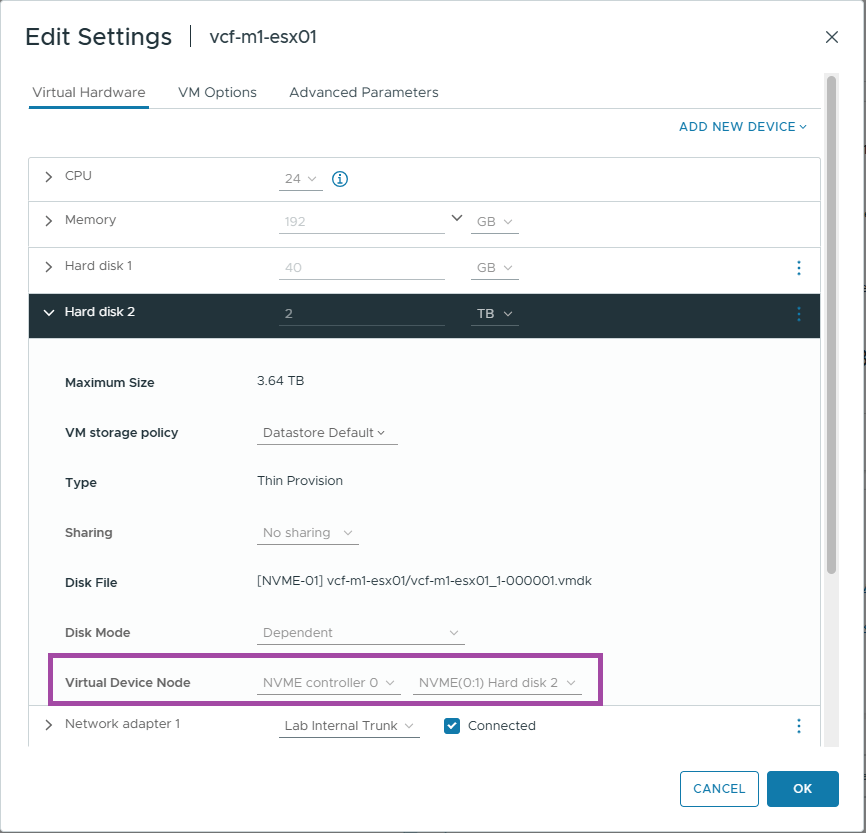 I’m deploying the management domain as a vSAN ESA cluster. The nested VM configuration is based on the following key settings: