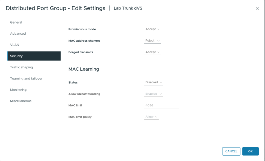 After some troubleshooting (than it should have been as Erik had already documented this issue – VCF 9.0 Nested Lab Deployment – vmk0) I worked out it was not working with MAC Learning, I revered my vDS config on my parent lab cluster and enabled Promiscuous mode and Forged Transmit – disabling Mac Learning
