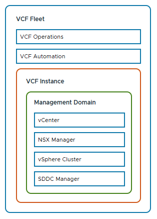 The diagram below shows the components of a VCF 9 deployment. It introduces the VCF Fleet, with Operations and Automation sitting above the VCF Instance. These fleet-level services provide centralised management across multiple instances, while each instance includes its own vCenter, NSX Manager, vSphere Cluster, and SDDC Manager.