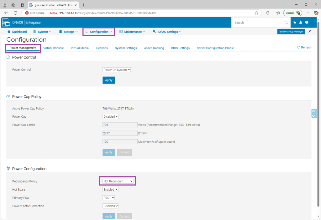 NOTE: When using systems with GPU, ensure that you install PSUs with 1100 W or higher, and set the PSU configuration to non-redundant mode.