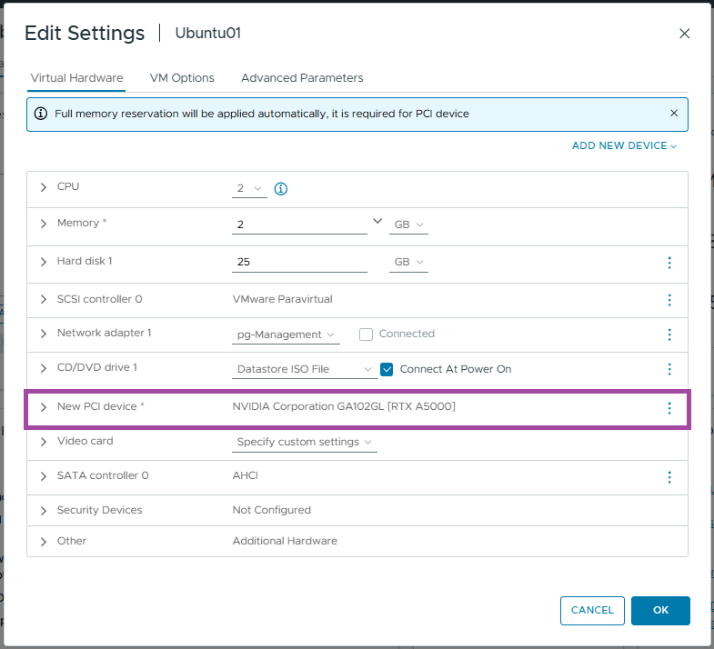 After adding the GPU, note the memory reservation requirement noted at the top.
