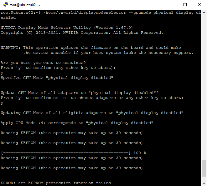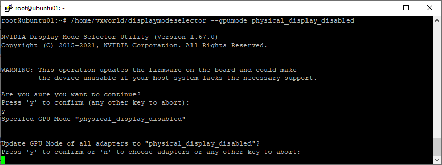 The commands below will set the display mode to disable for all GPUs passed to the VM. If you want to apply a change to a single GPU, read the documentation on the additional command line parameters.