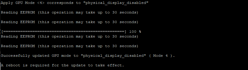 You should see, Successfully update GPU mode. If you get an error or after a reboot, you cannot access the GPU, check out the Troubleshooting Section below.